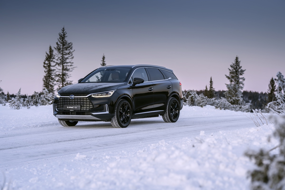 The pure-electric all-wheel-drive BYD Tang SUV driving in Norway